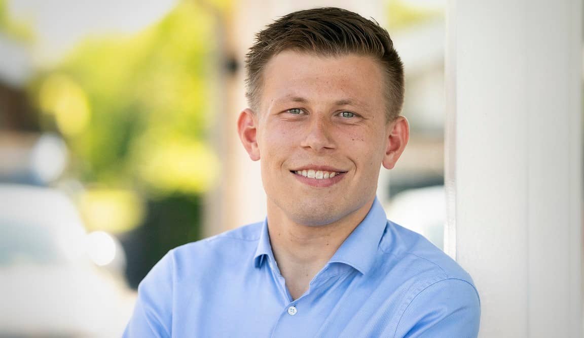 Sven Pluimers werkt bij een reclamebureau en is fractievolger van Progressief Woerden. Het is zijn missie om ook andere mensen met een beperking aan het werk te helpen.